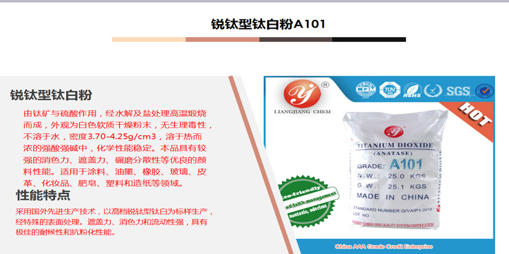 亮江牌-銳鈦型活性顏料鈦白粉A101是采用先進的漂洗、去離子水等工藝,具有優(yōu)良的光學(xué)性能和顏料性能,純高度、白度好、遮蓋力強、消色力高且易于分散,屬通用型鈦白粉,可廣泛用于涂料、油墨、橡膠、玻璃、皮革、化妝品、肥皂、塑料和造紙等領(lǐng)域。