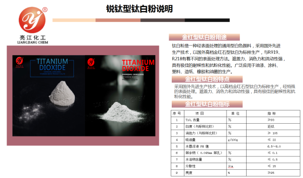 亮江牌-復(fù)合添加劑型鈦白粉A211(高分散型)是用采用先進(jìn)的生產(chǎn)工藝,經(jīng)過特殊的表面處理,與A200不同的是其具有白度高,擴(kuò)散性好,純度高,雜質(zhì)少,顆粒細(xì)小,對(duì)紫外線起屏蔽作用.是我司新型研究的一款適合用于各行業(yè)的高檔復(fù)合添加型二氧化鈦。適用于高檔的油漆、油墨、涂料,塑料,橡膠等領(lǐng)域。