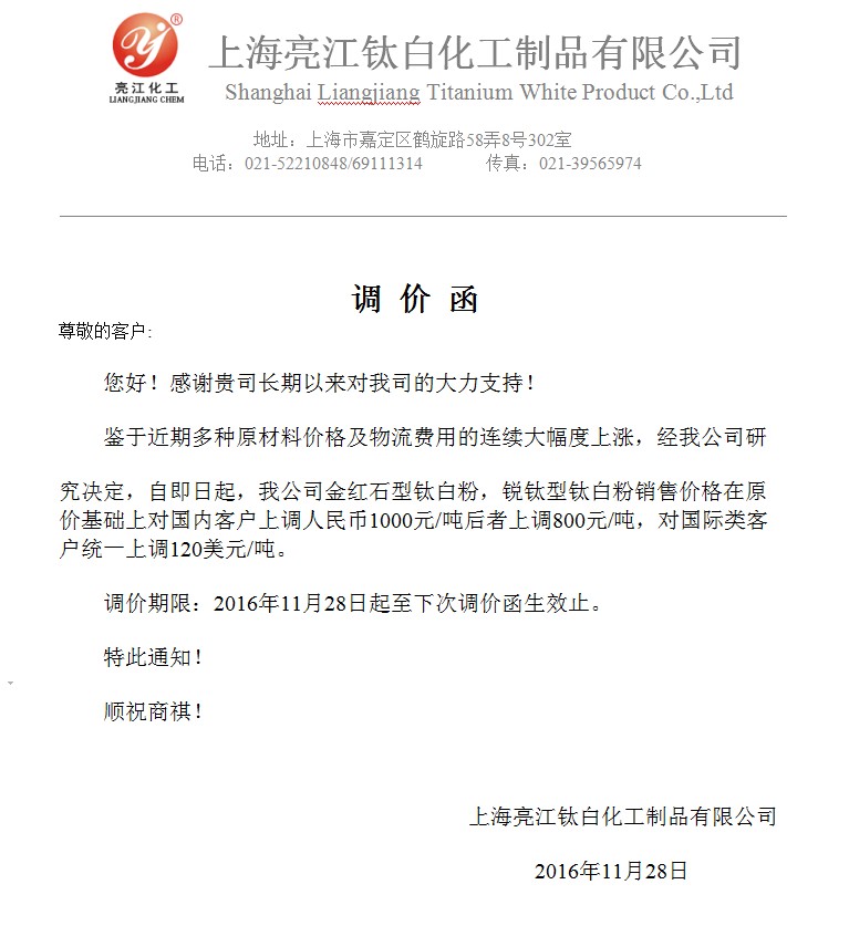 上海亮江鈦白化工制品有限公司 國(guó)內(nèi)銷(xiāo)售部電話:+86-21-52210848,69111314,69111420,39565954,52210846 國(guó)際外貿(mào)部電話:+86-21-69112714 傳 真:+86-21-39565974 E-MAIL:[email protected] 滬ICP備16042212號(hào)-1 版權(quán)聲明 |